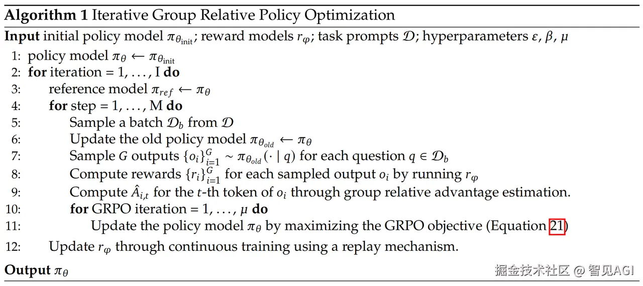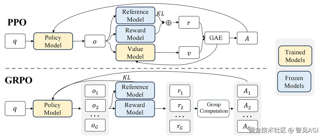 Group Relative Policy Optimization (GRPO) 是 Proximal Policy Optimization (PPO) 近端策略优化的变种 放弃了值模型和 critic 模型,从群奖励分数取计算Adventage,更新策略函数,大幅减少计算量