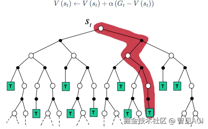 V(st)=V(st)+α(Gt−V(st))=V(st)=V(st)+α(rt+1+γ2rt+2+...+γT−t+2rT−V(st))