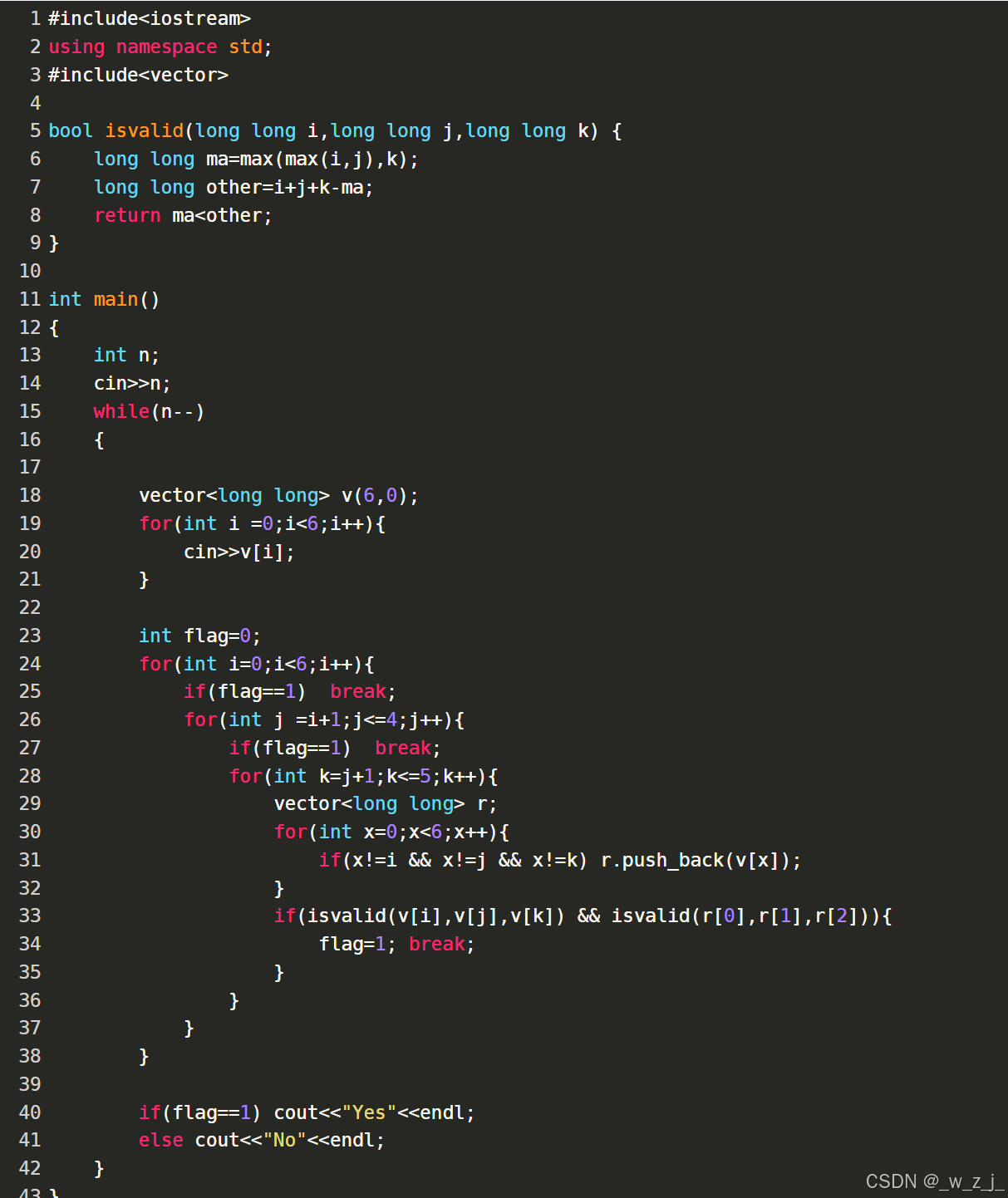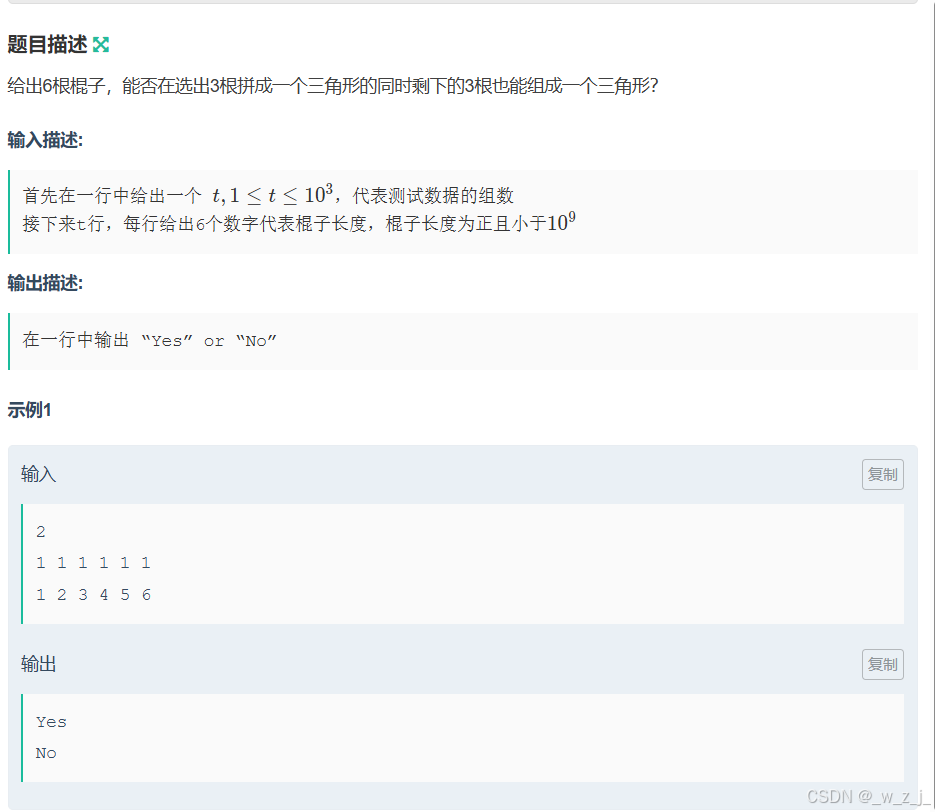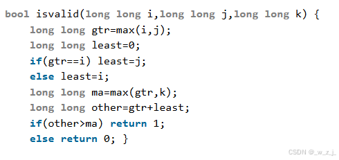 这个题可以用暴力遍历的方式进行计算,因为从六个数中选三个,数量比较少,只有20种情况。较小的两个边的和大于最大边的和是任意两个边和大于第三边和的充分必要条件。所以只需要将选择出来的三个边按照这个限制计算即可!
