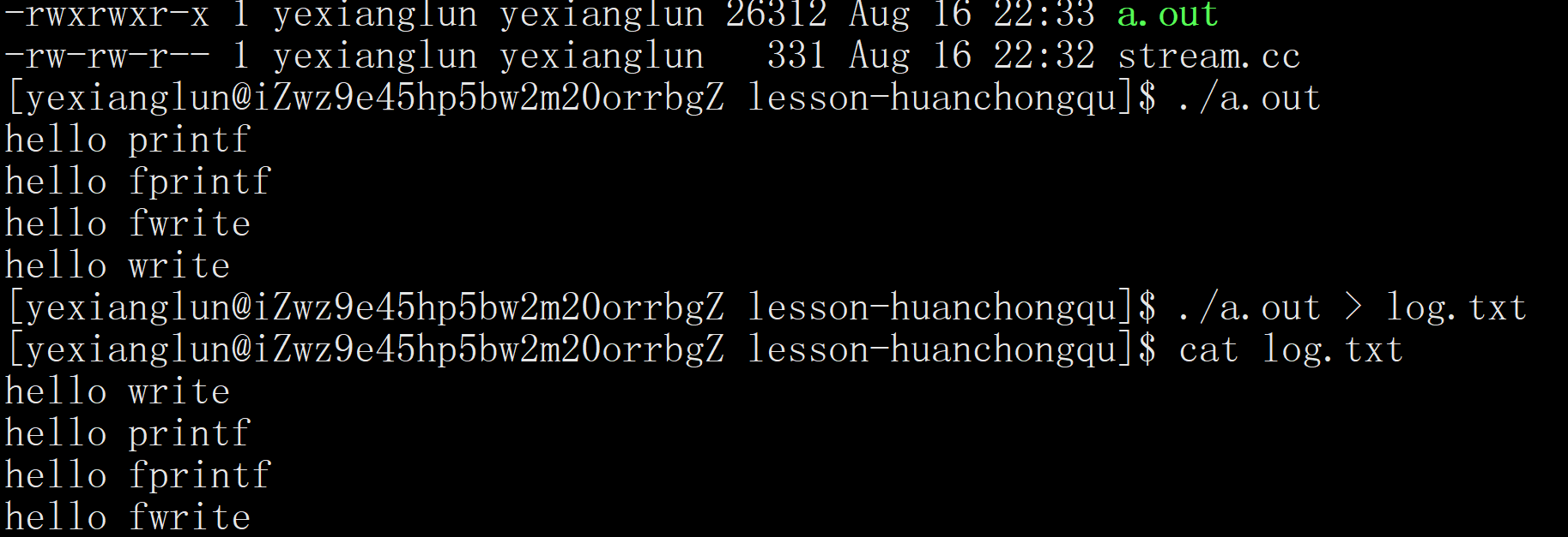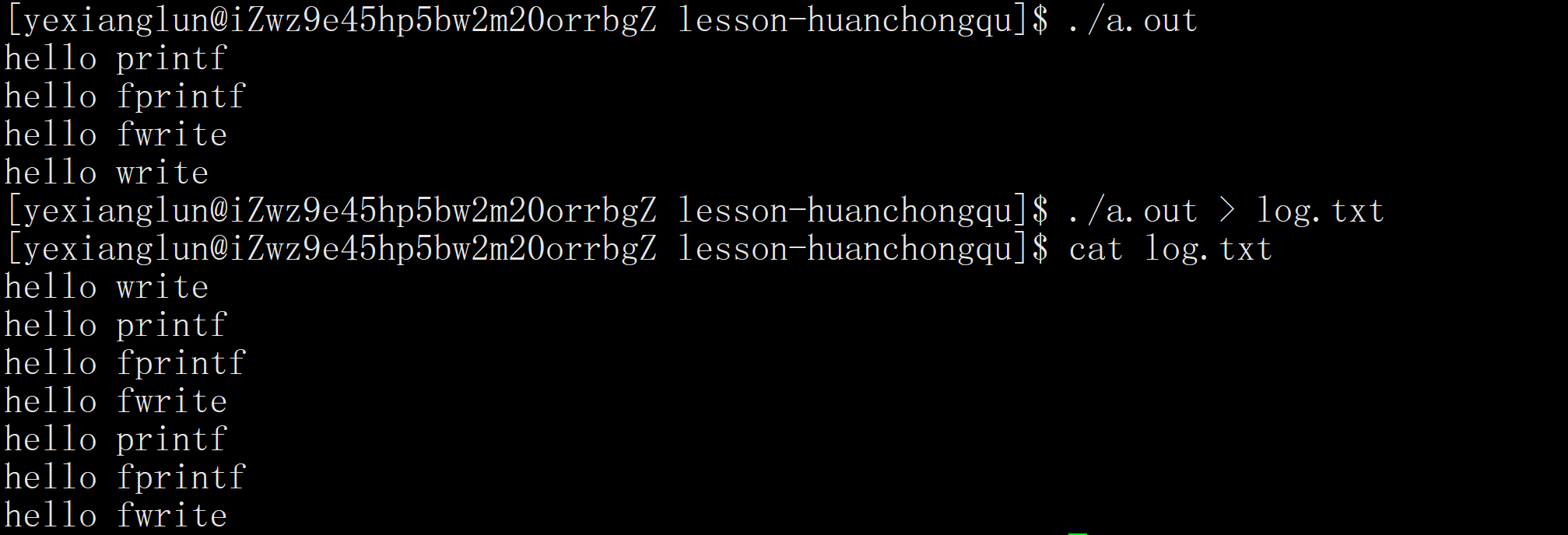 原因是因为fork时对应缓冲区的库函数的三条消息在fork执行的时候还在缓冲区里,父子进程代码共享就要各自都刷新一遍。系统调用的函数当程序进行到ss传给write时就已经传给系统了,fork时就不存在刷新问题了。而向显示器写入就不会发生刷新两次的问题,向文件写入就会刷新两次,文件在磁盘里。重定向还更改了缓冲区的刷新方式。