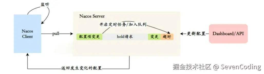 - 监听配置变化:Nacos Client可以通过注册监听器的方式,实现对配置信息的监听。当配置信息发生变化时,Nacos Server会通知已注册的监听器,并触发相应的回调方法。