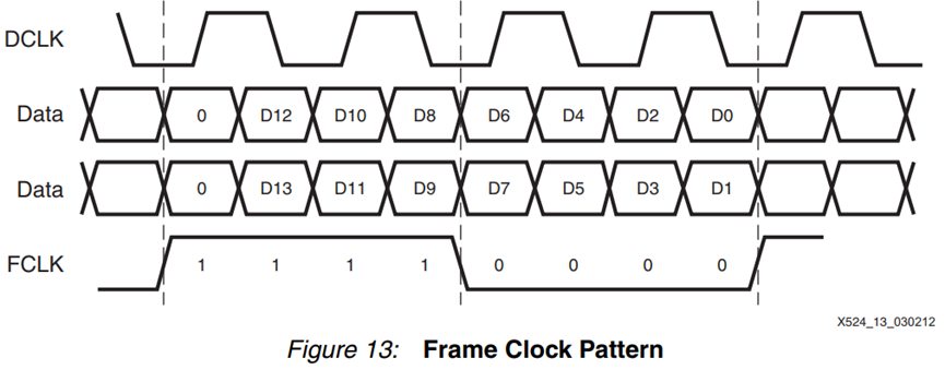 当ADC接口以2线模式运行时,帧模式如下图所示(16位,DDR,2线模式),当帧时钟对齐,一般数据通道也会受到正确数据: