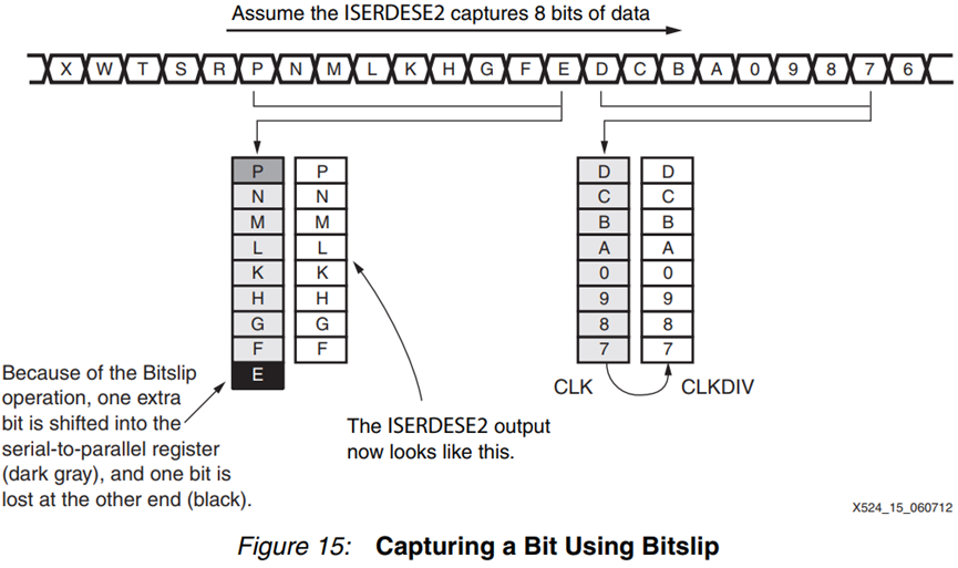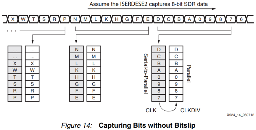 下图为在没有bitslip操作时捕获比特,当8个比特在捕获串转并放入并行寄存器从Q输出时,没有位移操作,无法控制解串出来的数据在原始比特流中的位置,获取不了正确的数据;