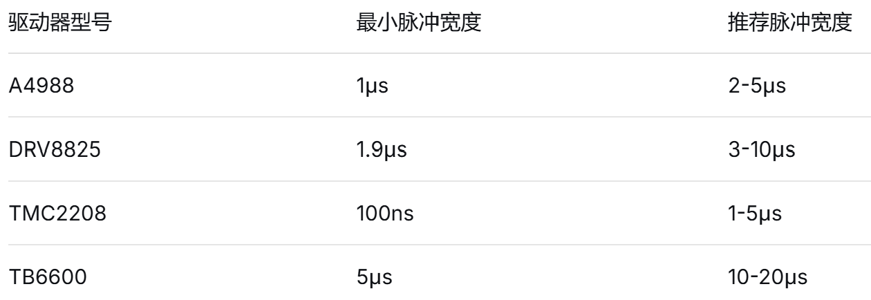 (1)步进电机的每个步进脉冲需要两个边沿(上升沿和下降沿)来构成一个完整的方波周期。但是,在步进电机驱动中,我们通常只关心脉冲的上升沿(或者下降沿)来触发步进电机走一步。