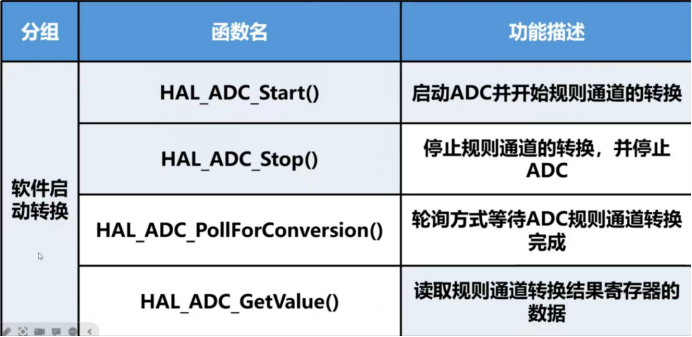 函数HAL ADC Start()以软件方式启动ADC规则通道的转换,软件启动转换后,调用函数HAL_ ADC_ PollForConversion()查询转换是否完成;转换完成后可用函数HAL _ADC _GetValue()读取结果寄存器里的数据;使用函数HAL ADC Stop()停止ADC规则通道转换。