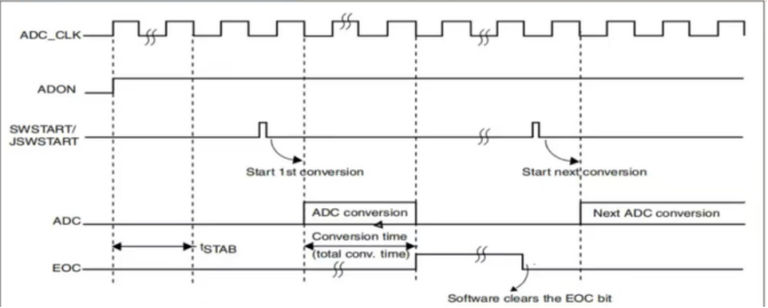 ADC在启动前需要一个稳定时间tSTAB准确转换。ADC转换开始后,需要最少15个时钟周期设置EOC标志(在12位ADC模式下),使用16位ADC寄存器存储转换结果。