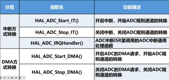 当ADC设置为用定时器或外部信号触发转换时,函数HAL ADC StartIT()用于启动转换,这会开启ADC的中断。当ADC转换完成时会触发中断,在中断服务程序里,可以用HAL ADC GetValue()读取转换结果寄存器里的数据。函数HAL _ADC _Stop IT()可以关闭中断。