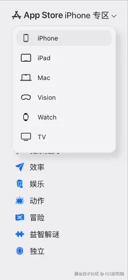 独立开发者或小型团队往往难以配齐 Mac、iPad、Vision、Apple Watch 等所有苹果设备,给多设备适配调研带来阻碍。网页版的设备专区切换功能恰好解决了这一难题,左上角下拉菜单即可一键切换至对应设备的专属应用页面。想确认自家应用在 Mac 端的展示效果,或是调研 Watch 端的热门应用类型,只需打开浏览器就能直观查看,零成本完成多设备适配验证。