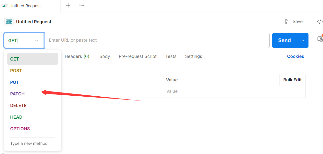 Postman里面可以在 请求方法下拉框 ,非常方便的选择HTTP请求的方法。
