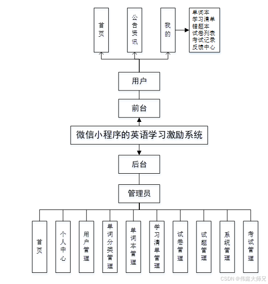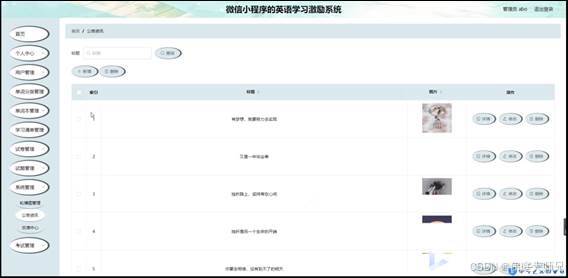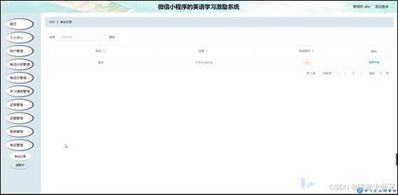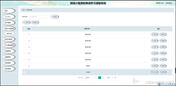 管理员登录系统后,可以对首页,个人中心,用户管理,单词分类管理,单词本管理,学习清单管理,试卷管理,试题管理,系统管理,考试管理等功能进行相应操作,如图5-8所示。