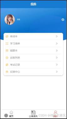 用户,在我的页面可以对单词本,学习清单,错题本,试卷列表,考试记录,反馈中心等详细信息进行操作,如图5-6所示。