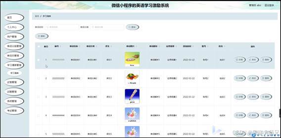 学习清单管理,在学习清单管理页面可以对索引、编号、单词名称、单词分类、译文、单词图片、单词解析、应用场景、添加时间、账号、姓名等内容进行详情,修改或删除等操作,如图5-12所示。