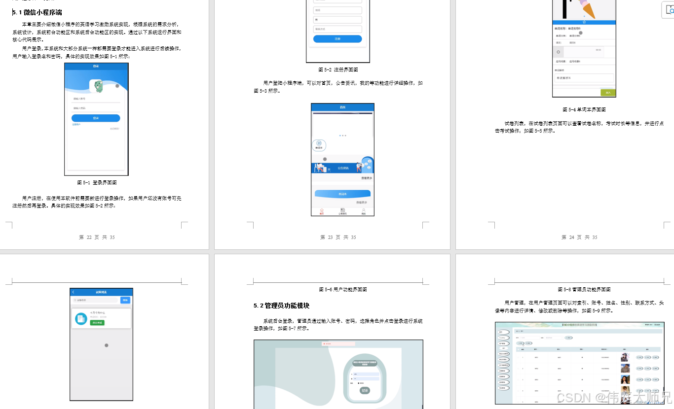 本章主要介绍微信小程序的英语学习激励系统实现,根据系统的需求分析,系统设计,系统前台功能区和系统后台功能区的实现。通过以下系统运行界面和核心代码展示。