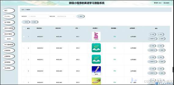单词本管理,在单词本管理页面可以对索引、单词名称、单词分类、译文、单词图片、语音播报、应用场景等内容进行详情,修改,查看评论或删除等操作,如图5-11所示。
