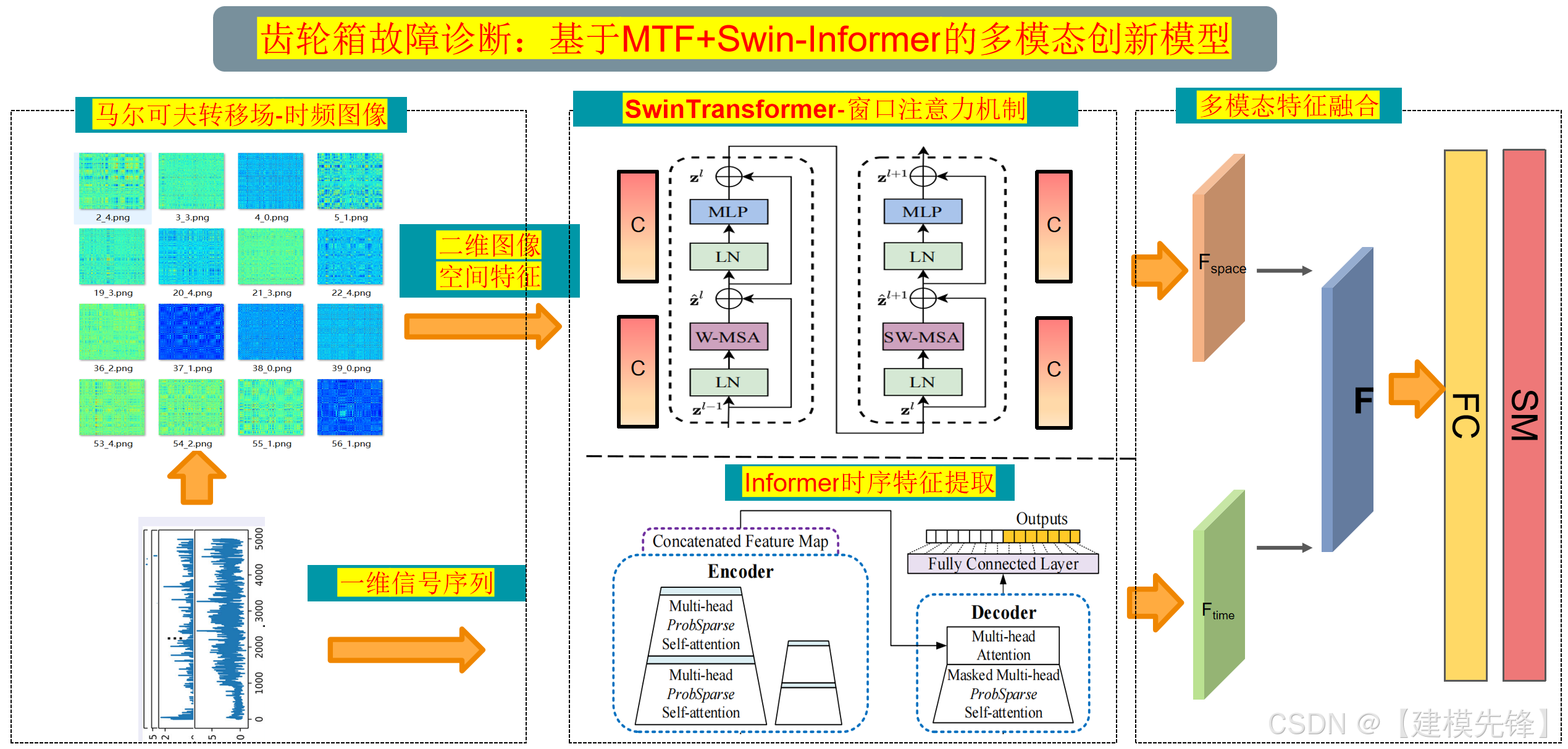 (1)创新性多模态融合框架,首次将MTF+Swin Transformer结合Informer架构应用于齿轮箱故障诊断,充分利用时频空间信息与时域长序列信息的互补优势。
