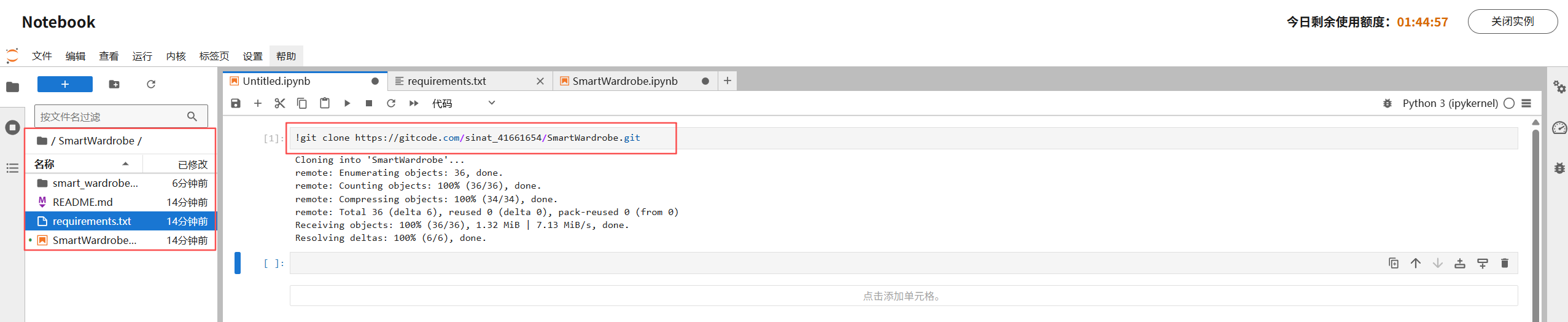 在SmartWardrobe目录下打开SmartWardrobe.ipynb文件,执行第一个cell下的命令,安装依赖包: