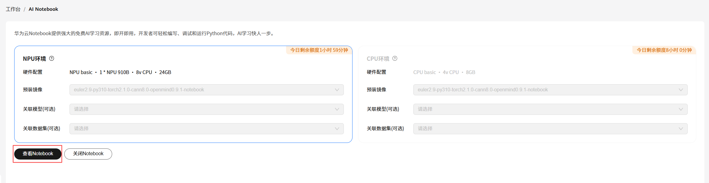 | 开发者空间 - AI Notebook | NPU basic · 1 * NPU 910B · 8v CPU · 24GB | euler2.9-py310-torch2.1.0-cann8.0-openmind0.9.1-notebook | 免费 | 120 |