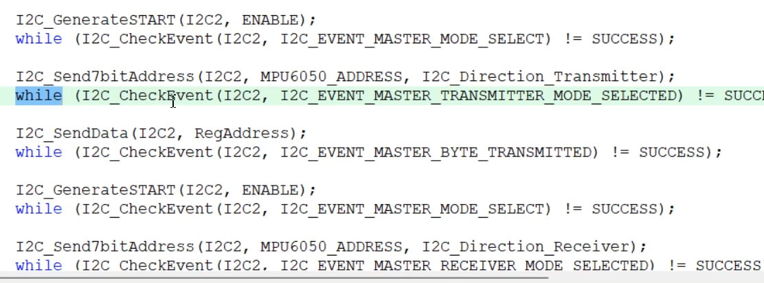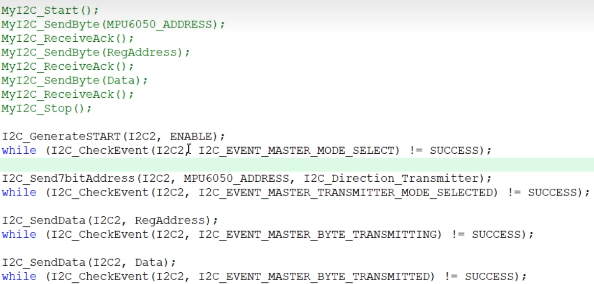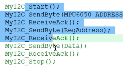 对应着软件I2C的START,但是软件I2C这些函数,内部都是有delay的。是一种阻塞式的流程,也就是函数运行完成之后,对应的波形也肯定发送完毕了。所以上一个函数运行完成之后,就可以紧跟下一个函数了。