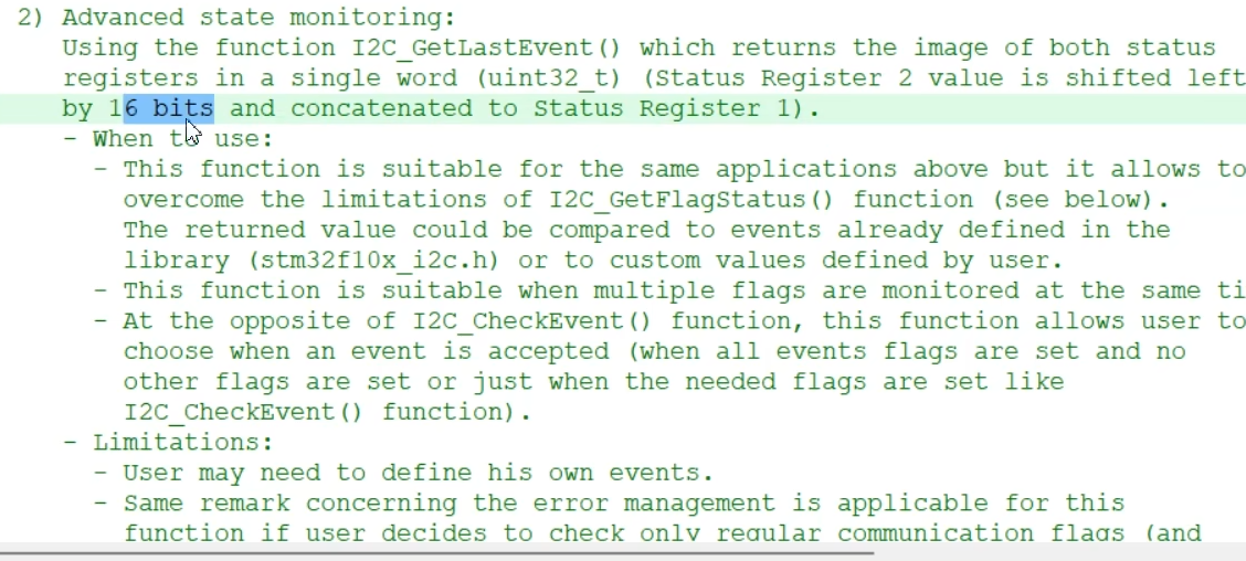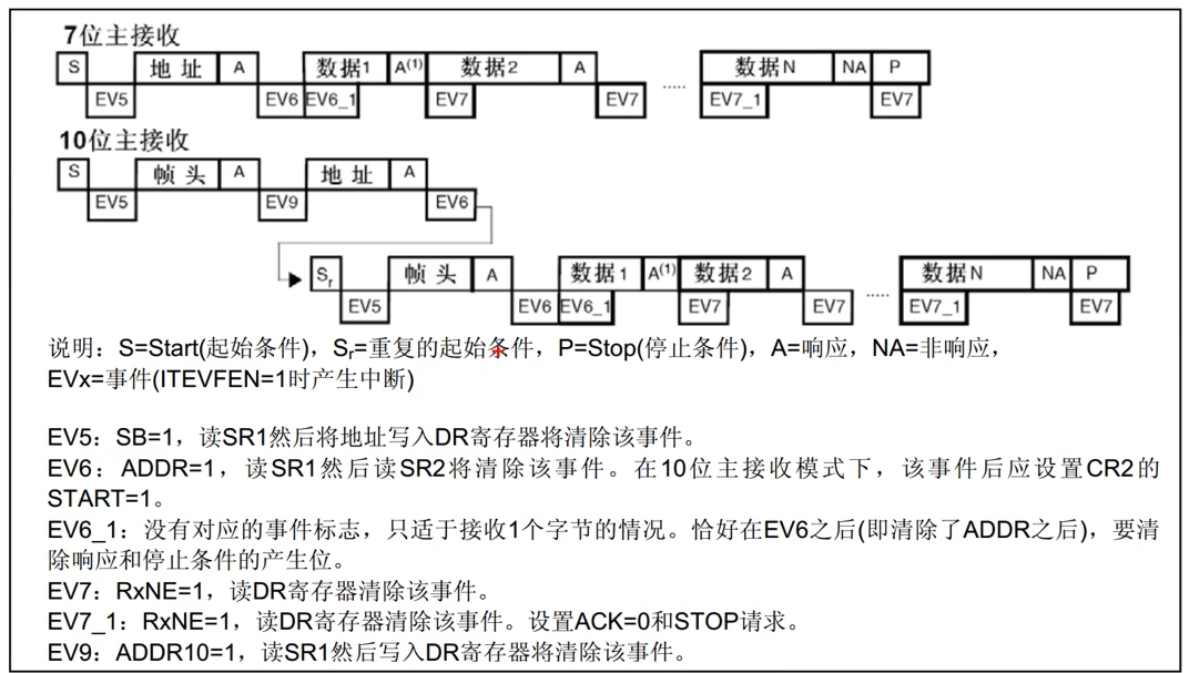 总结一下就是,如果你是读取多个字节,那么直接等待EV7事件,读取DR就能收到数据了,这样依次接受,在接受最后一个字节之前就是EV7_1事件需要提取把ACK置0,STOP置1。