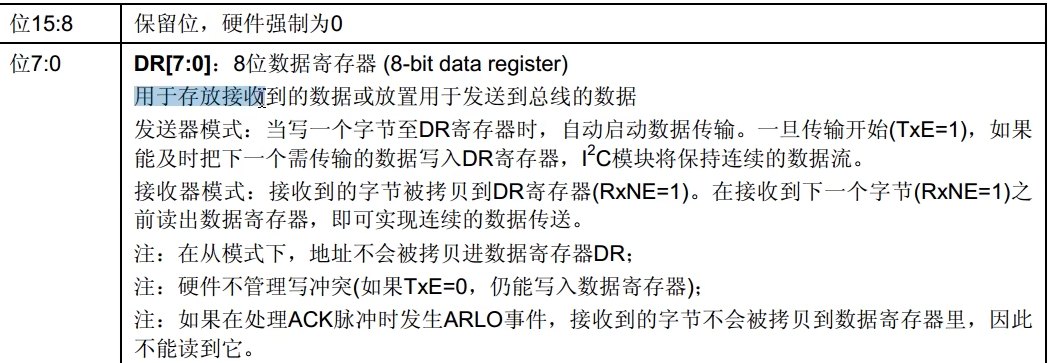 也就是告诉我们要把应答位ACK置0,同时把停止条件生成位SYOP置1。那你可能会问,这时不应该是接受数据吗,数据都没有收到就要产生停止条件吗。答案确实如此,这里规定在接受最后一个字节之前,就要提前把ACK置0,同时设置停止位STOP。因为我们是接收一个字节。所以再进入接受模式之后就要立刻ACK置0,同时设置停止位STOP。