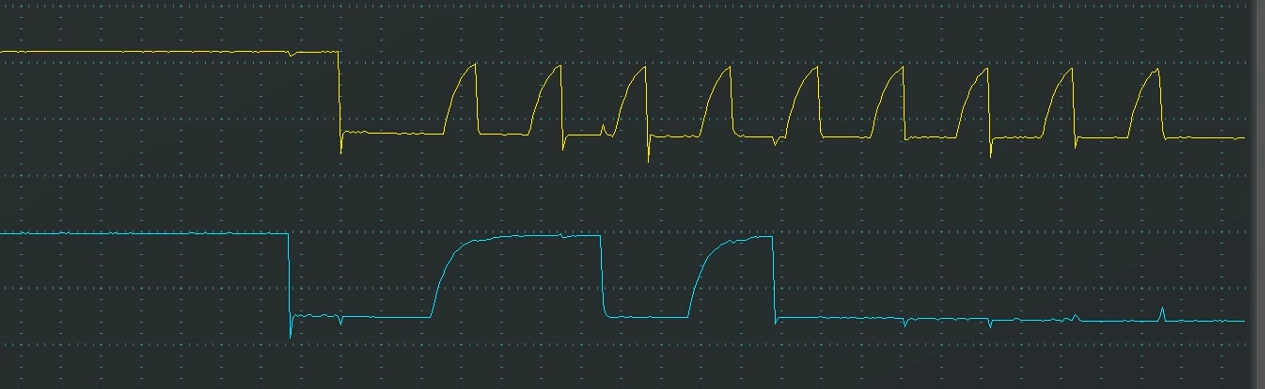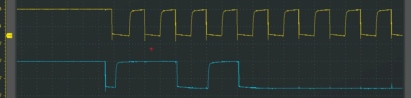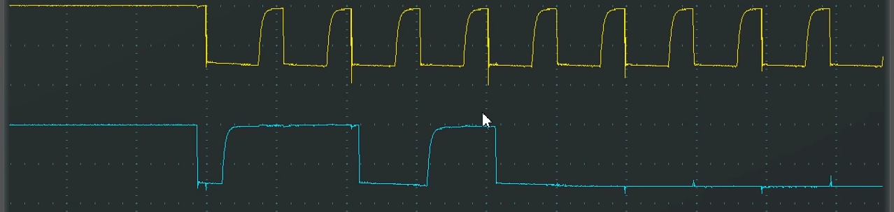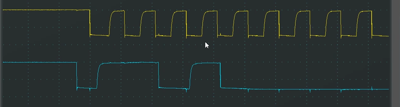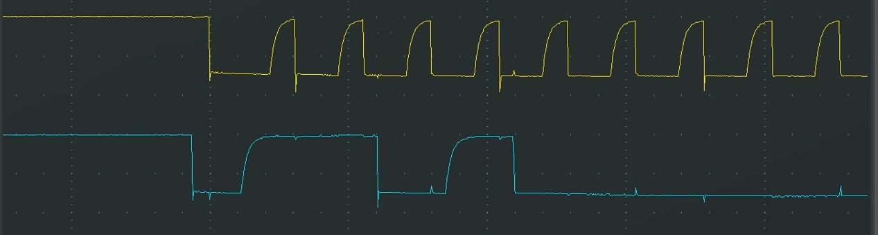 可以看到SCL释放之后还没有完全回弹到高电平,就立马被拉下来了,所以整个SCL波形就变成三角形了。