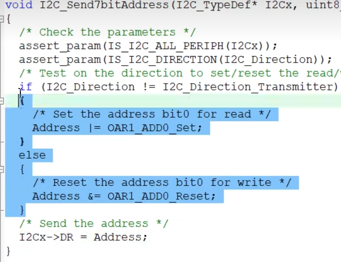 可以看到Address这个参数也是通过DR发送的,只不过在发送之前,帮我们设置了Address最低位的读写位。如果direction不是发送,那么就把Address最低位置1,也就是读,否则最低位清0也就是写。
