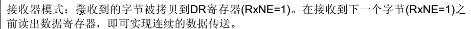 可以看到在接收模式下,接收到的字节被拷贝到DR寄存器中这时就是RXNE=1,接收寄存器非空,那么在接收到下一个数据之前读出数据寄存器,即可实现连续的数据传输。