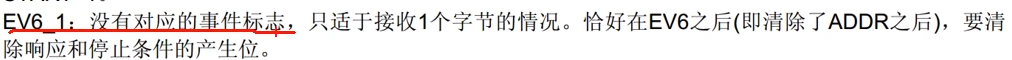 这个事件没有标志位,也不需要我们等待。只适用于接受一个字节的情况。正好我们是指定地址读一个字节。所以EV6之后恰好是清除响应和停止条件的产生。