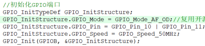 初始化一下GPIO,把输出模式改为复用开漏输出,开漏是I2C协议的要求,复用是GPIO的控制权要交给硬件外设,我们是硬件I2C所以控制引脚任务肯定得交给外设来做了。如果是之前的软件I2C的话,我们通过软件来控制引脚,就只用把模式改为开漏模式。然后端口改为PIN10和PIN11然后初始化GPIOB。