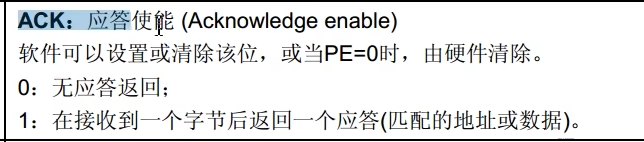 对照手册可以看到,就是应答使能。就是STM32作为主机,在接收到一个字节后,是给从机应答,还是非应答,就取决于ACK这一位,如果ACK为1就是给从机应答,如果ACK为0就是非应答