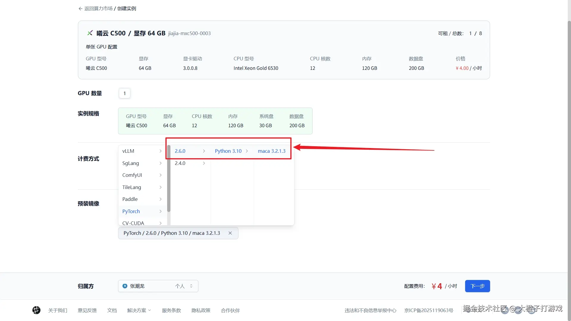 以沐曦 曦云C500型号 为例,租用一张64GB,镜像选择 PyTorch / 2.6.0 / Python 3.10 / maca 3.2.1.3