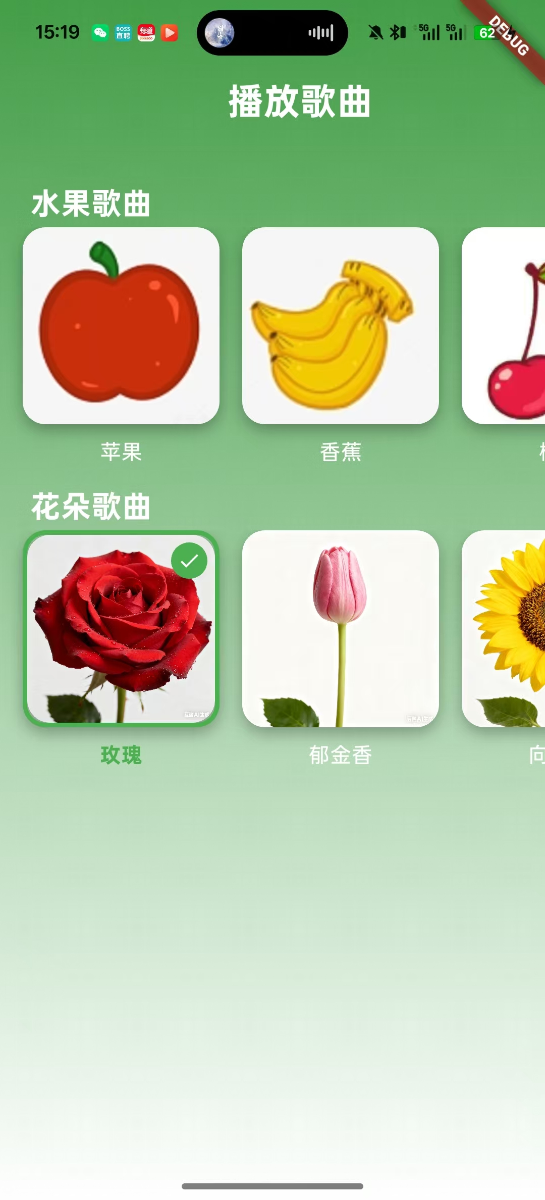 花朵歌曲: [玫瑰❌, 郁金香✅, 向日葵❌] ← 只有郁金香显示选中状态