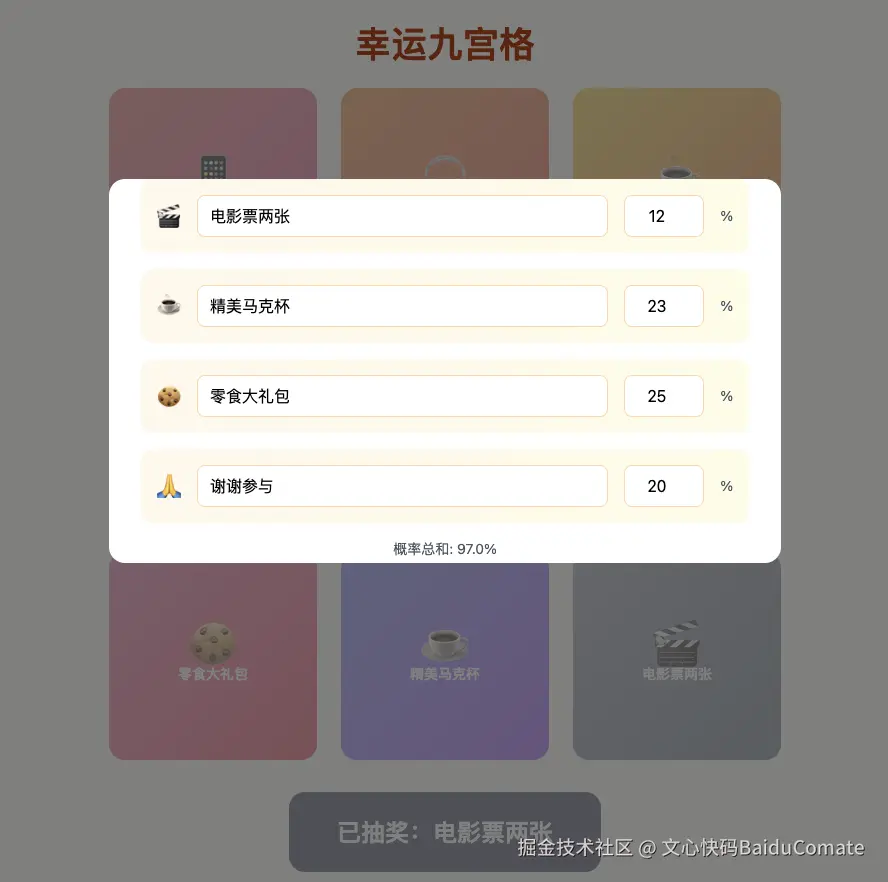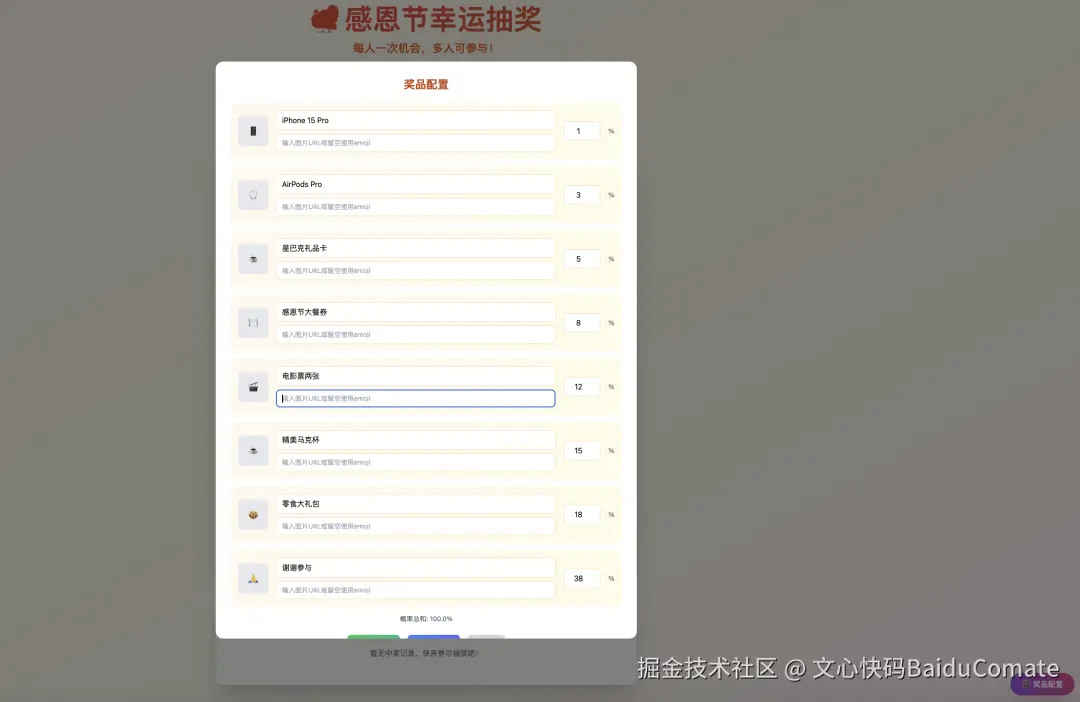 点击"奖品配置"按钮,可以修改奖品及对应概率(会提示当前概率总和,很方便):