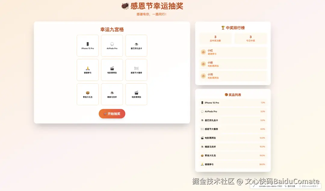 在清晨的早上,我在公司吃着早餐,刷着抖音推荐的大数据长腿生物,听着后端兄弟讲八卦,突然一条消息弹窗弹出,里面的需求要我完成感恩节的抽奖页面,看着简单的几句话,我知道又要占据我几天的时间去忙碌,纯前端的页面不需要后端参与,斜眼看了下隔壁后端老哥的嘴角微微一笑。但是作为墨鱼圣子怎会妥协,我想起百度文心快码已经更新到3.5S,可以快速从0-1搭建,更加智能,就像钢铁侠中贾维斯一样明确你发出的指令(抽象描述词),而且可以免费使用,那还等什么,赶紧用起来哈哈~~~