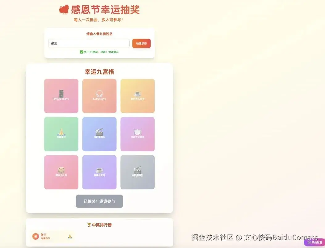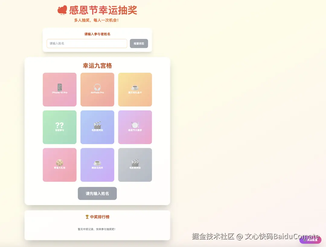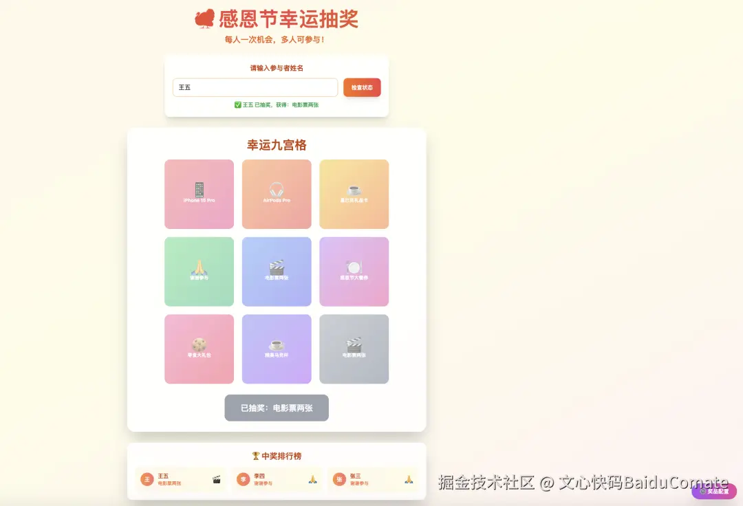 当前页面已具备抽奖基本功能,但仍不能实现奖品配置和真实员工姓名与奖品一一对应,九宫格也略显简陋,再次输入Prompt进行优化: