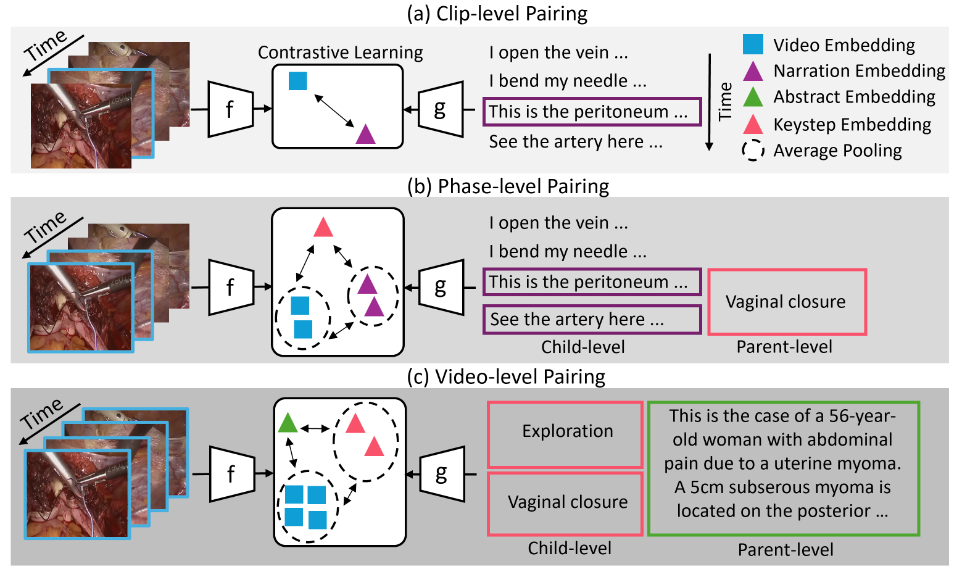多层对比学习,红色是手术流程中不同阶段的核心操作描述,绿色是对整个手术视频的摘要文本(病例总结)