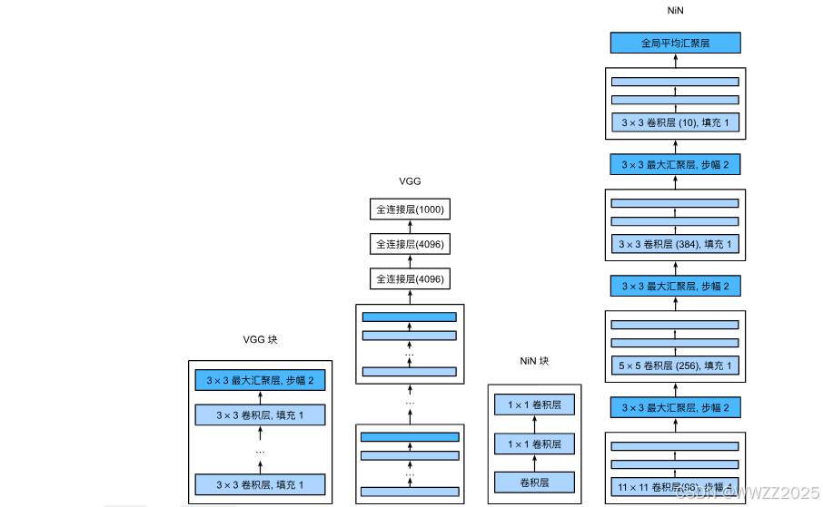 (2)NiN使用全局平均池化层替代VGG、AlexNet中全连接层,不易过拟合、更少的参数个数。