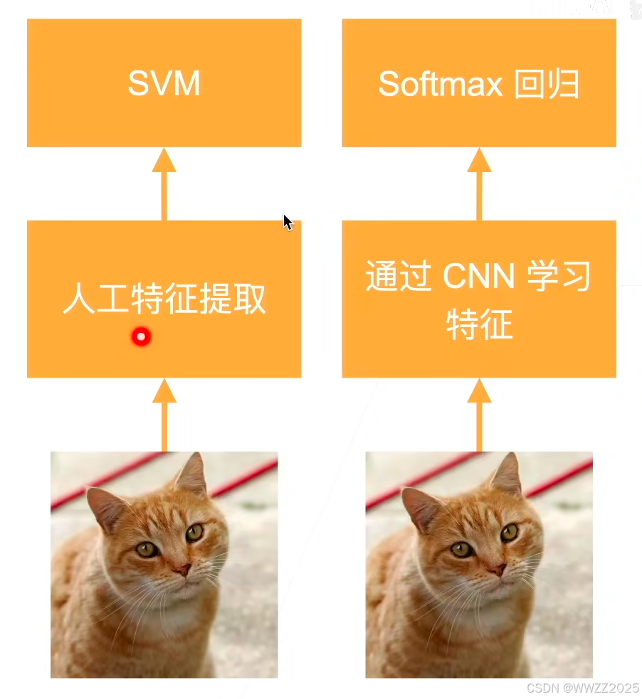 2012年,引起深度学习热潮。本质是更深、更大的LeNet,改进点:丢弃法、ReLu、MaxPooling,其使得计算机视觉方法论改变。左图为标准机器学习处理方案、右图为深度学习处理方案。
