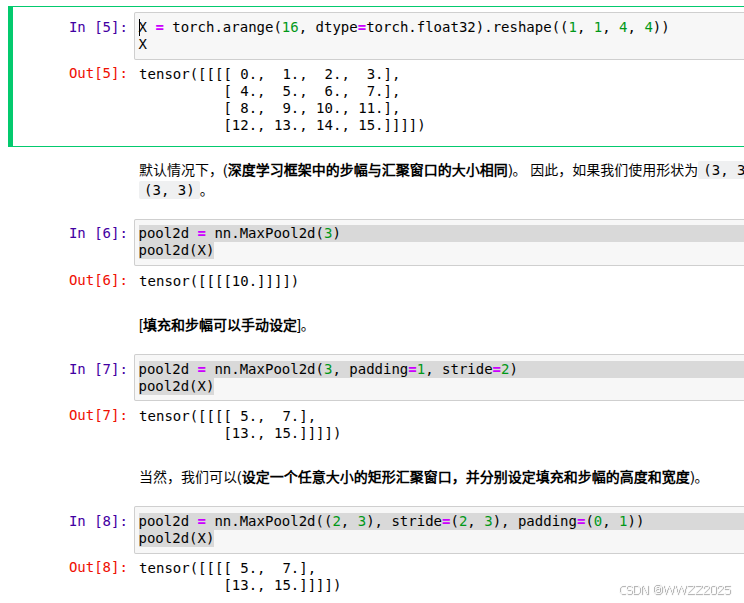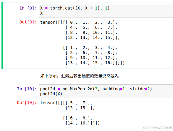 X = torch.cat((X, X + 1), 1) X pool2d = nn.MaxPool2d(3, padding=1, stride=2) pool2d(X)