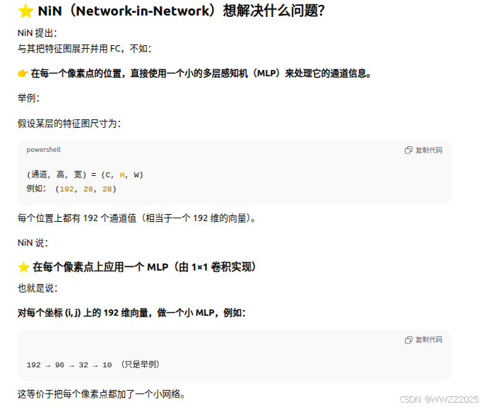 (1)NiN块使用卷积层+两个1x1卷积层,后者对每个像素增加了非线性;