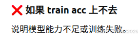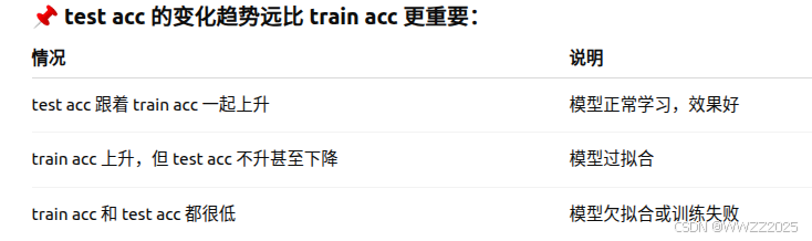 b.train acc越高越好,但不能比test acc高太多,正常情况是逐渐上升最终接近100%;