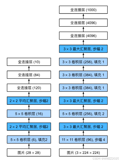 AlexNet论文中使用ImageNet数据,量更大;此处用的是Fashion-MNIST(训练集6万张、测试集1万张),将其像素调整为和ImageNet一致224*224。