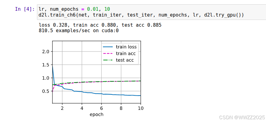 lr, num_epochs = 0.01, 10 d2l.train_ch6(net, train_iter, test_iter, num_epochs, lr, d2l.try_gpu())训练效果查看方法: