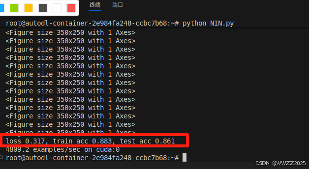 net = nn.Sequential( nin_block(1, 96, kernel_size=11, strides=4, padding=0), nn.MaxPool2d(3, stride=2), nin_block(96, 256, kernel_size=5, strides=1, padding=2), nn.MaxPool2d(3, stride=2), nin_block(256, 384, kernel_size=3, strides=1, padding=1), nn.MaxPool2d(3, stride=2), nn.Dropout(0.5), # 标签类别数是10 nin_block(384, 10, kernel_size=3, strides=1, padding=1), nn.AdaptiveAvgPool2d((1, 1)), # 将四维的输出转成二维的输出,其形状为(批量大小,10) nn.Flatten()) #查看每层输出 X = torch.rand(size=(1, 1, 224, 224)) for layer in net: X = layer(X) print(layer.__class__.__name__,'output shape:\t', X.shape)(3)训练模型
