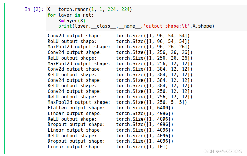 import torch from torch import nn from d2l import torch as d2l net = nn.Sequential( #大卷积+大步幅=快速拉开不同物体的空间差异 # 这里使用一个11*11的更大窗口来捕捉对象。 # 同时,步幅为4,以减少输出的高度和宽度。 # 另外,输出通道的数目远大于LeNet nn.Conv2d(1, 96, kernel_size=11, stride=4, padding=1), nn.ReLU(), nn.MaxPool2d(kernel_size=3, stride=2), #提取中层图像特征,如边缘组合、纹理 # 减小卷积窗口,使用填充为2来使得输入与输出的高和宽一致,且增大输出通道数 nn.Conv2d(96, 256, kernel_size=5, padding=2), nn.ReLU(), nn.MaxPool2d(kernel_size=3, stride=2), #提取高层抽象特征,如脸部结构、物体部件、类别相关形状 # 使用三个连续的卷积层和较小的卷积窗口。 # 除了最后的卷积层,输出通道的数量进一步增加。 # 在前两个卷积层之后,汇聚层不用于减少输入的高度和宽度 nn.Conv2d(256, 384, kernel_size=3, padding=1), nn.ReLU(), nn.Conv2d(384, 384, kernel_size=3, padding=1), nn.ReLU(), nn.Conv2d(384, 256, kernel_size=3, padding=1), nn.ReLU(), nn.MaxPool2d(kernel_size=3, stride=2), #将多通道卷积特征展开为一维向量 nn.Flatten(), # 这里,全连接层的输出数量是LeNet中的好几倍。使用dropout层来减轻过拟合 nn.Linear(6400, 4096), nn.ReLU(), nn.Dropout(p=0.5), nn.Linear(4096, 4096), nn.ReLU(), nn.Dropout(p=0.5), # 最后是输出层。由于这里使用Fashion-MNIST,所以用类别数为10,而非论文中的1000 nn.Linear(4096, 10))(2)观察每一层输出情况