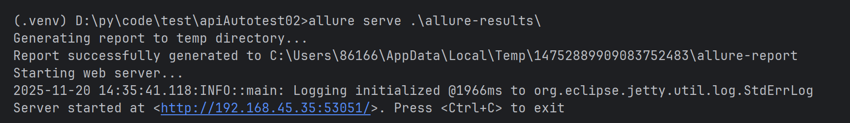 终端执行命令: allure serve [options] <allure-result>,自动在浏览器打开测试 报告