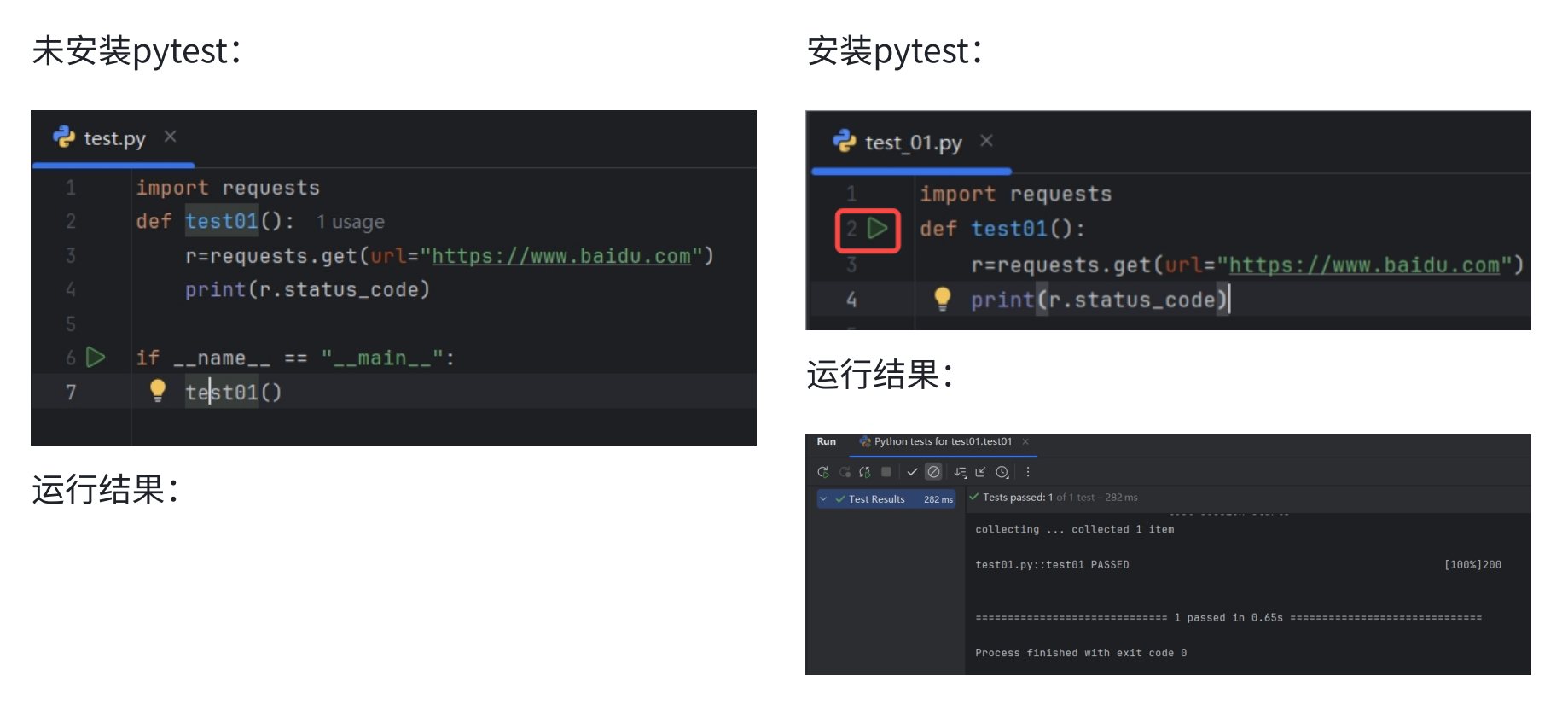 两张对比图可以明显看出来,未安装pytest框架的情况下需要编写main函数,在main函数中手动