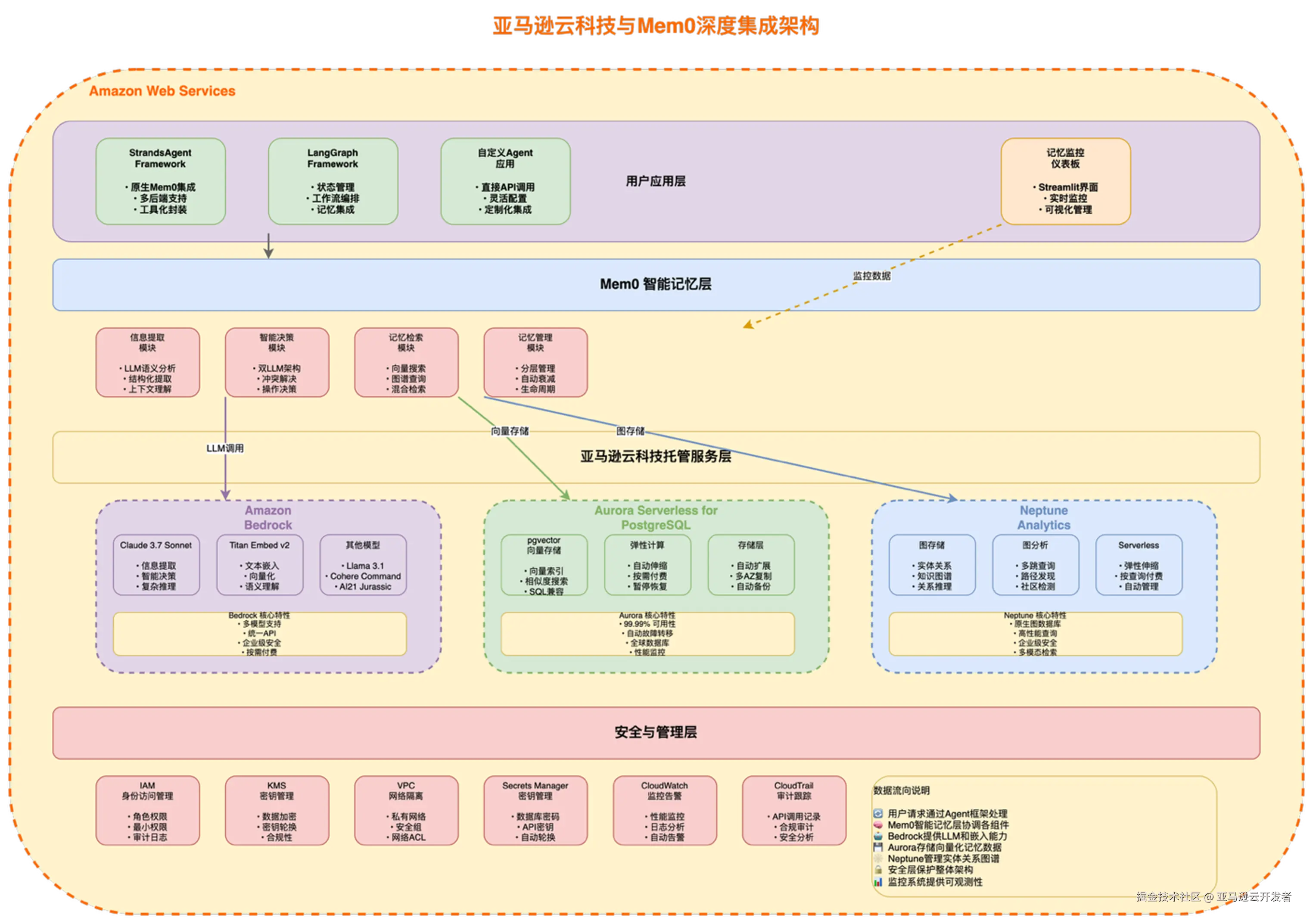 亚马逊云科技为Mem0提供了完整的服务生态支持,开发者可以根据具体需求选择最适合的亚马逊云科技服务组合。