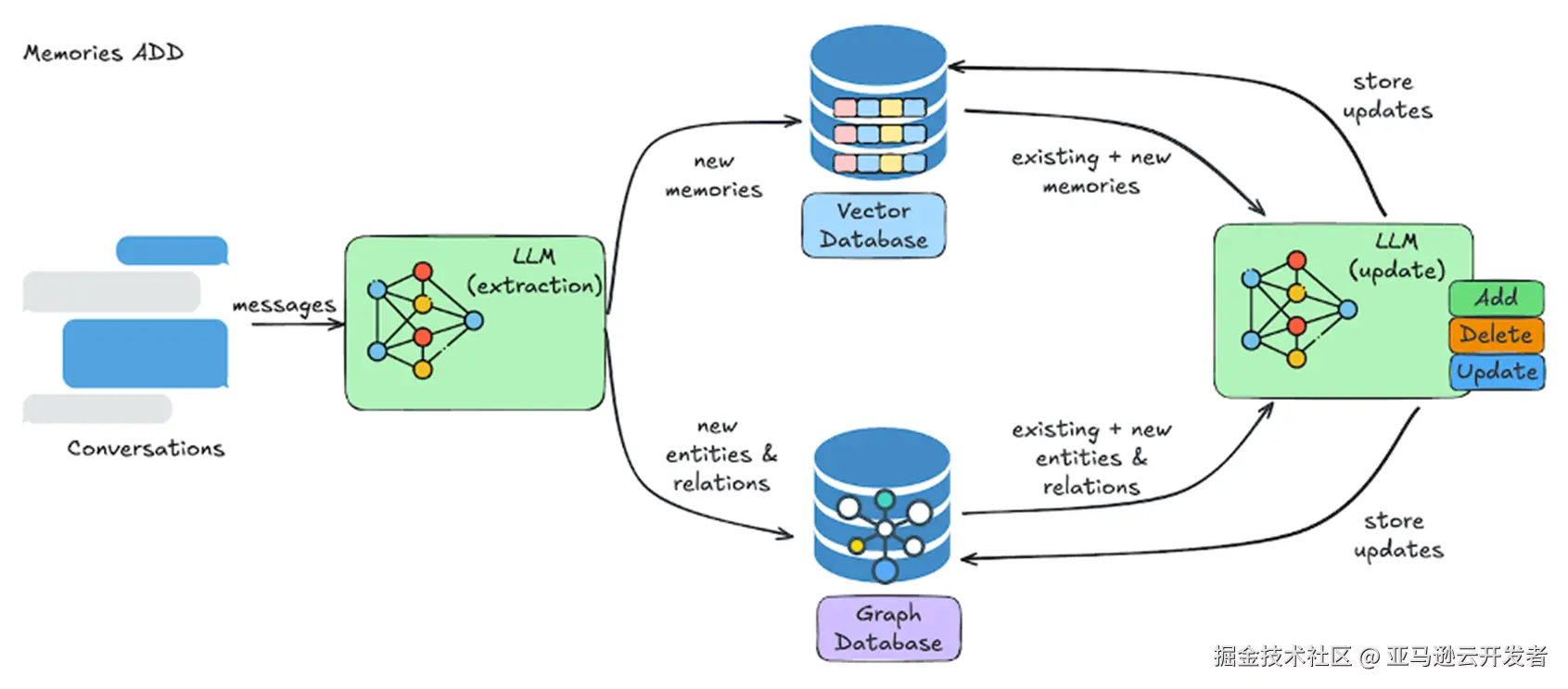 Mem0对于记忆的添加流程如下图所示。(图片来源:Mem0官方文档)