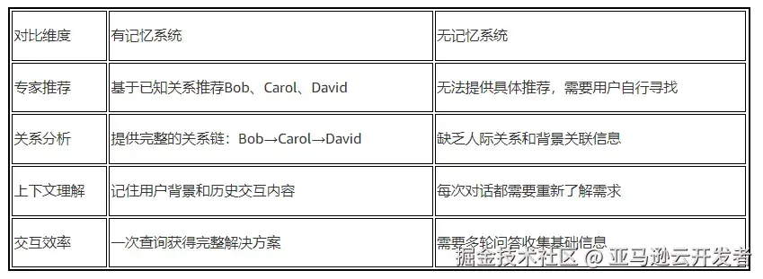 通过上述多轮对话演示,我们可以清晰地看到记忆系统与传统无记忆系统的核心差异: